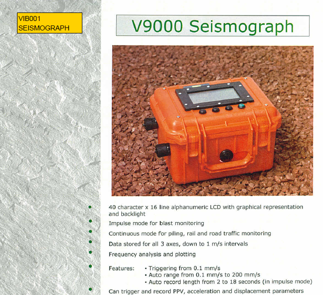 The all new V9000 Seismograph is designed and manufactured by Vibrock Ltd to meet the needs of our customers.  The V9000 Seismograph is a battery powered portable vibration monitor, designed for monitoring blasting, piling, demolition, construction and traffic vibrations.  It can also monitor dominant frequencies as well as air overpressure from blasting, using the optional microphone.