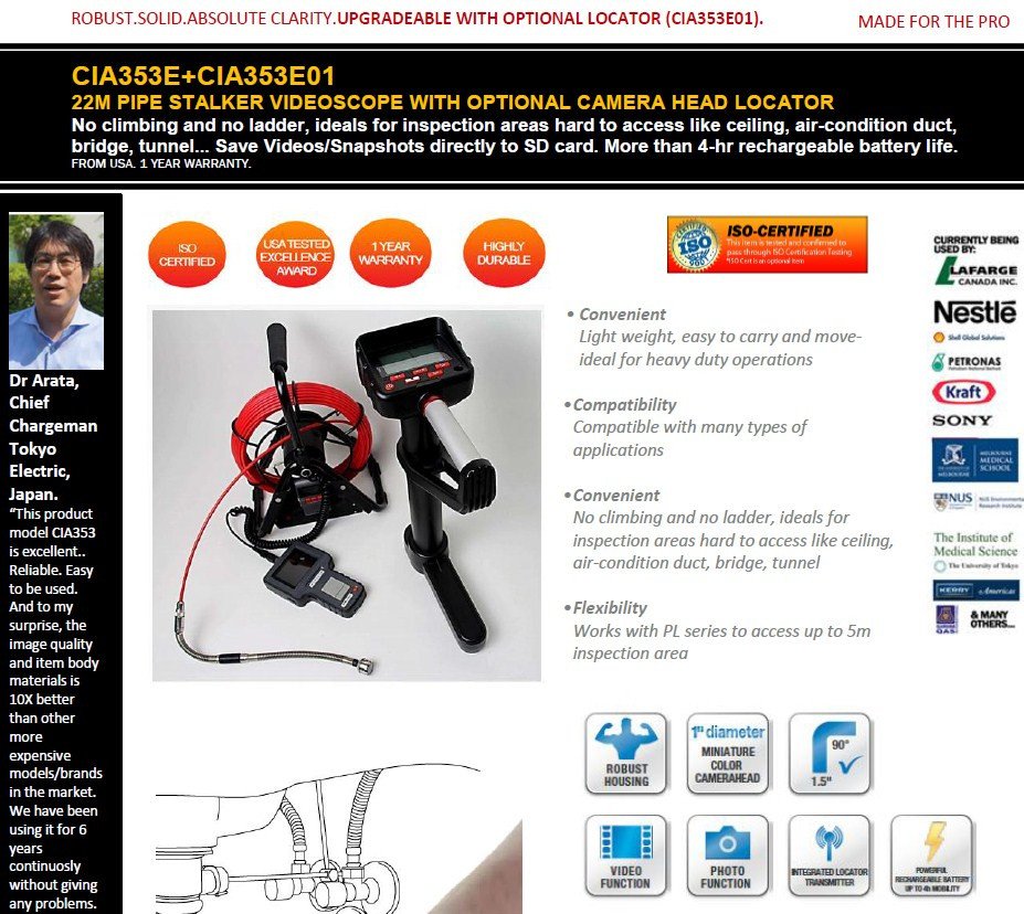You are here: Home Products By Brands MEGGER-UK Inspection Cameras/Borescopes/VideoScopes/FiberScopes CIA353E + CIA353E01 - 22M PIPE STALKER WITH OPTIONAL CAMERA HEAD LOCATOR - LATEST