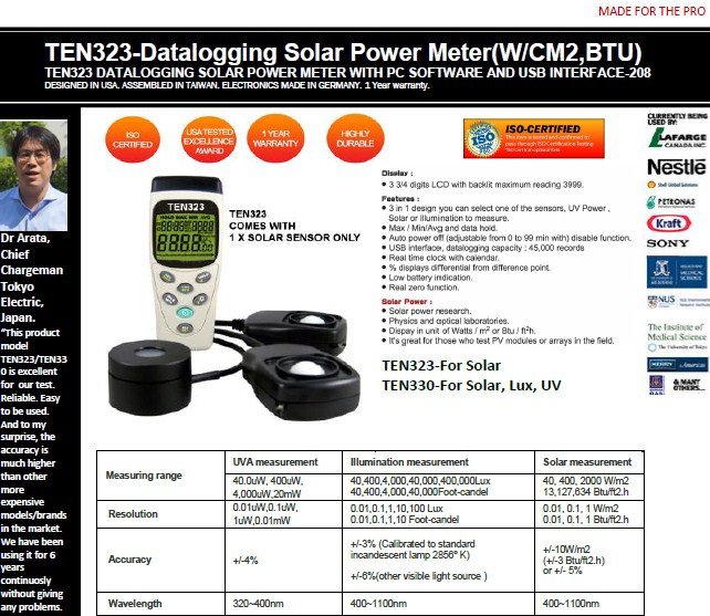 TEN323-Datalogging Solar Power Meter(W/CM2,BTU)