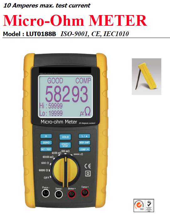 FEATURES * 4 terminal devices for accurate measurement of very low resistance. * Ideal for measuring the resistance of components precisely. * Ideal for testing protective conductors, lightning conductors and welded points. * Maximum test current is 10A ( 60000uΩ range only ). * Have two working mode , Resistive and Inductive mode, Normal is resistive mode. * Good / Fail set-function for input quality control. * Built-in in buzzer sound (GOOD STATUS) to assist the Q.C. judgment. * Especial "CALCULATE" function to measure cable / wire length.